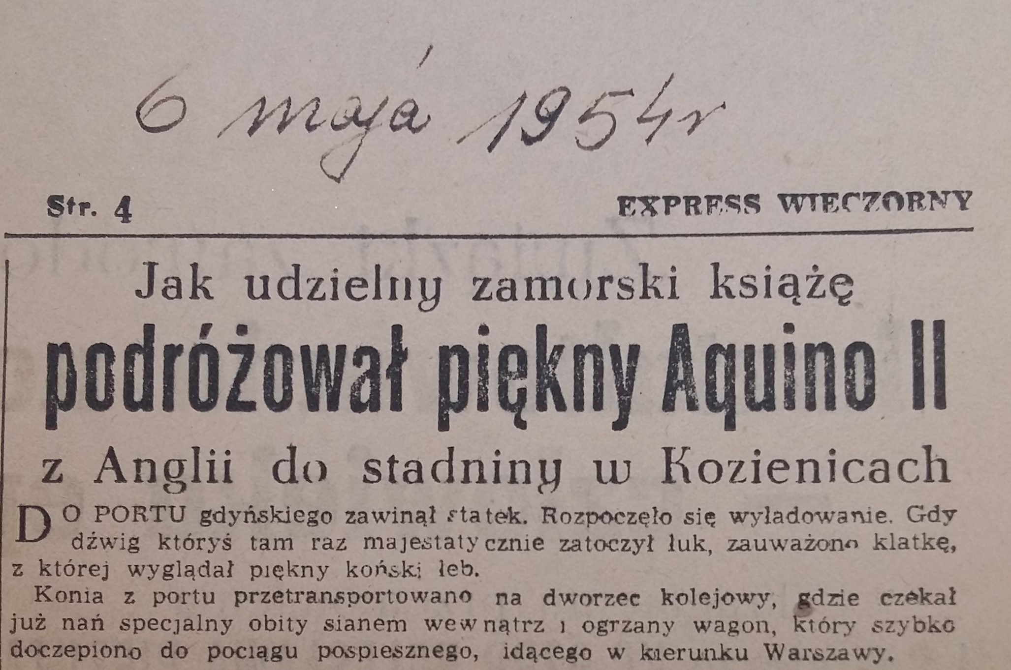 Stefan Czajkowski na łamach Expressu Wieczornego 6 maja 1954 roku pisał o sprowadzeniu do Polski ogiera Aquino.